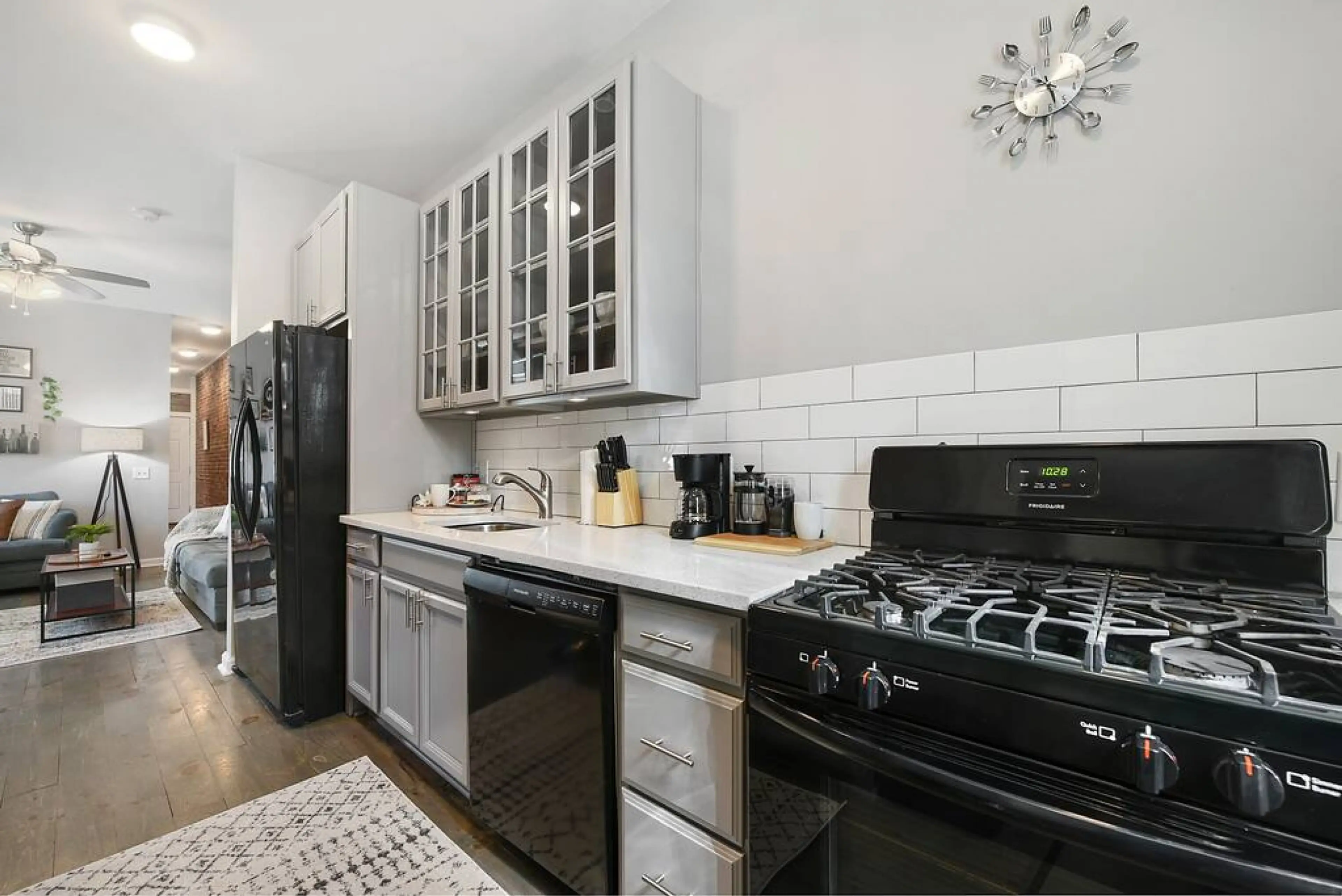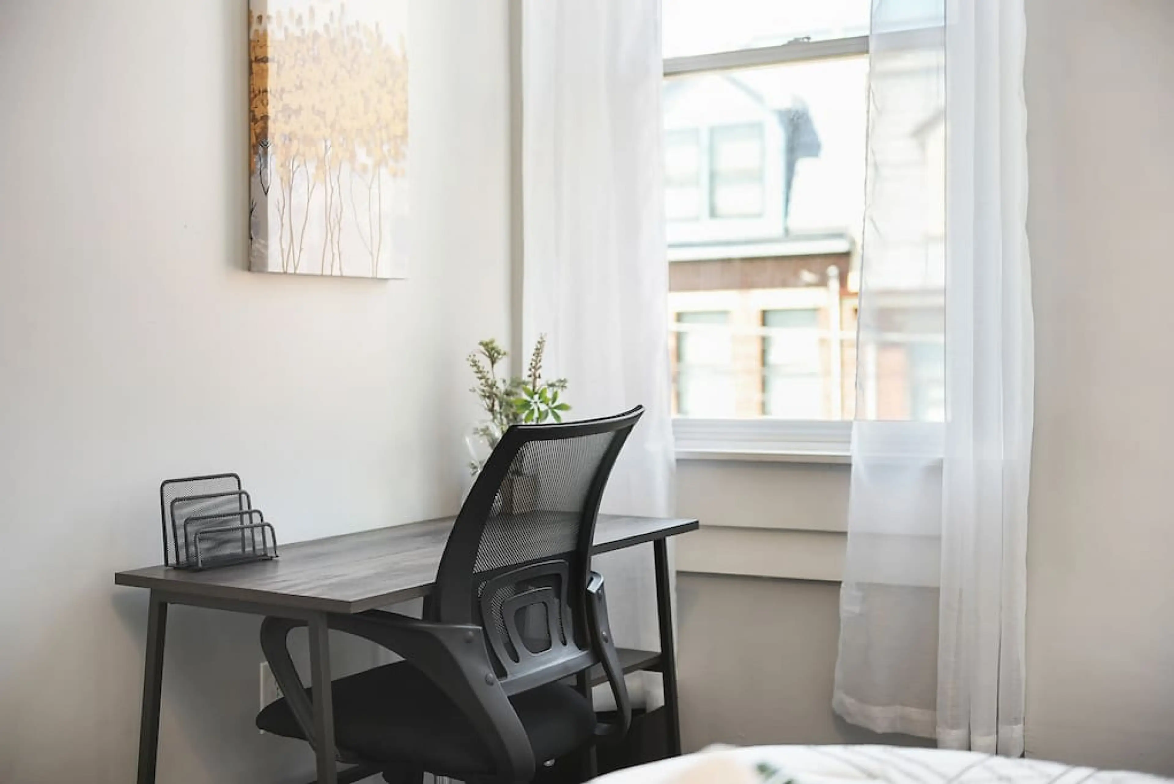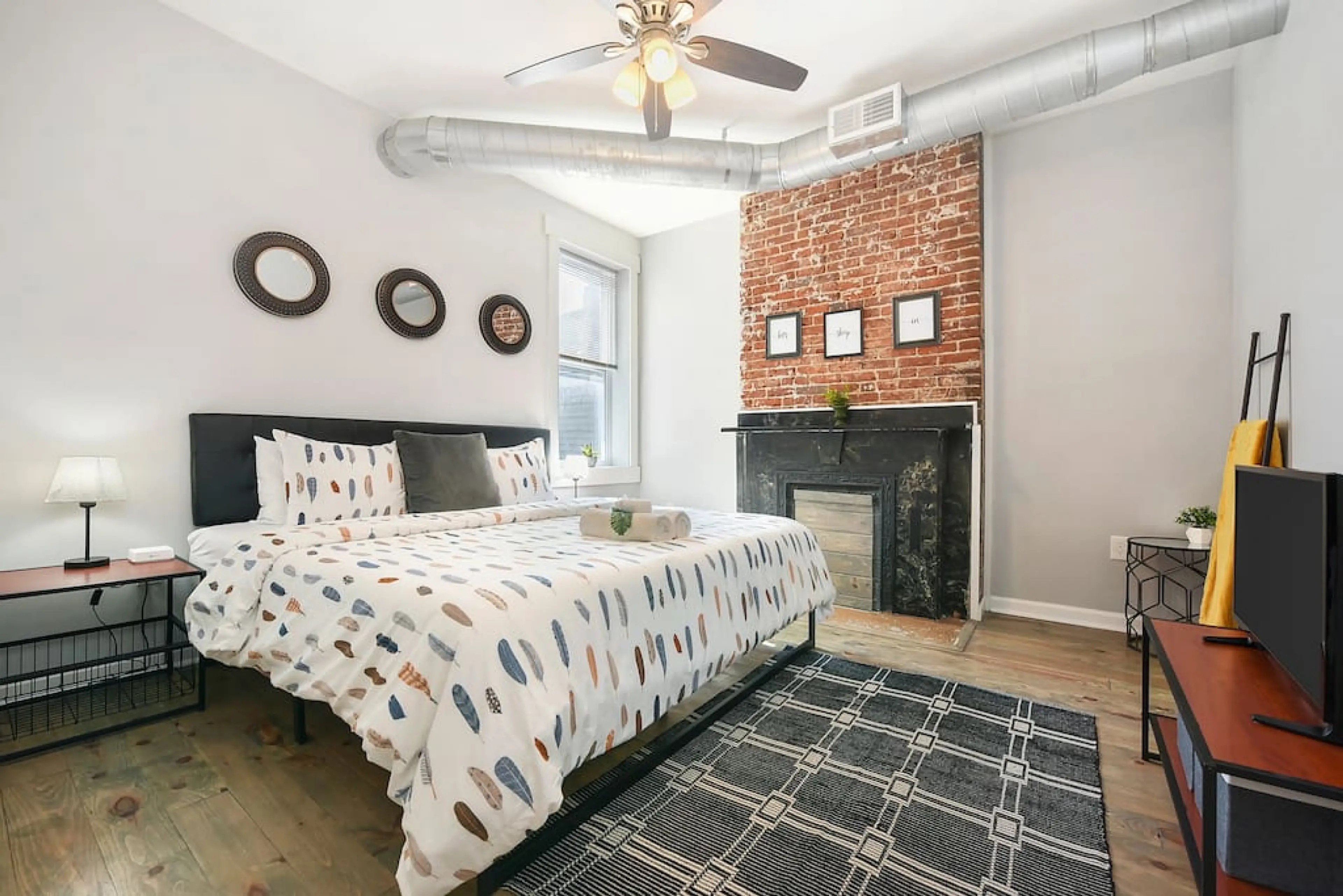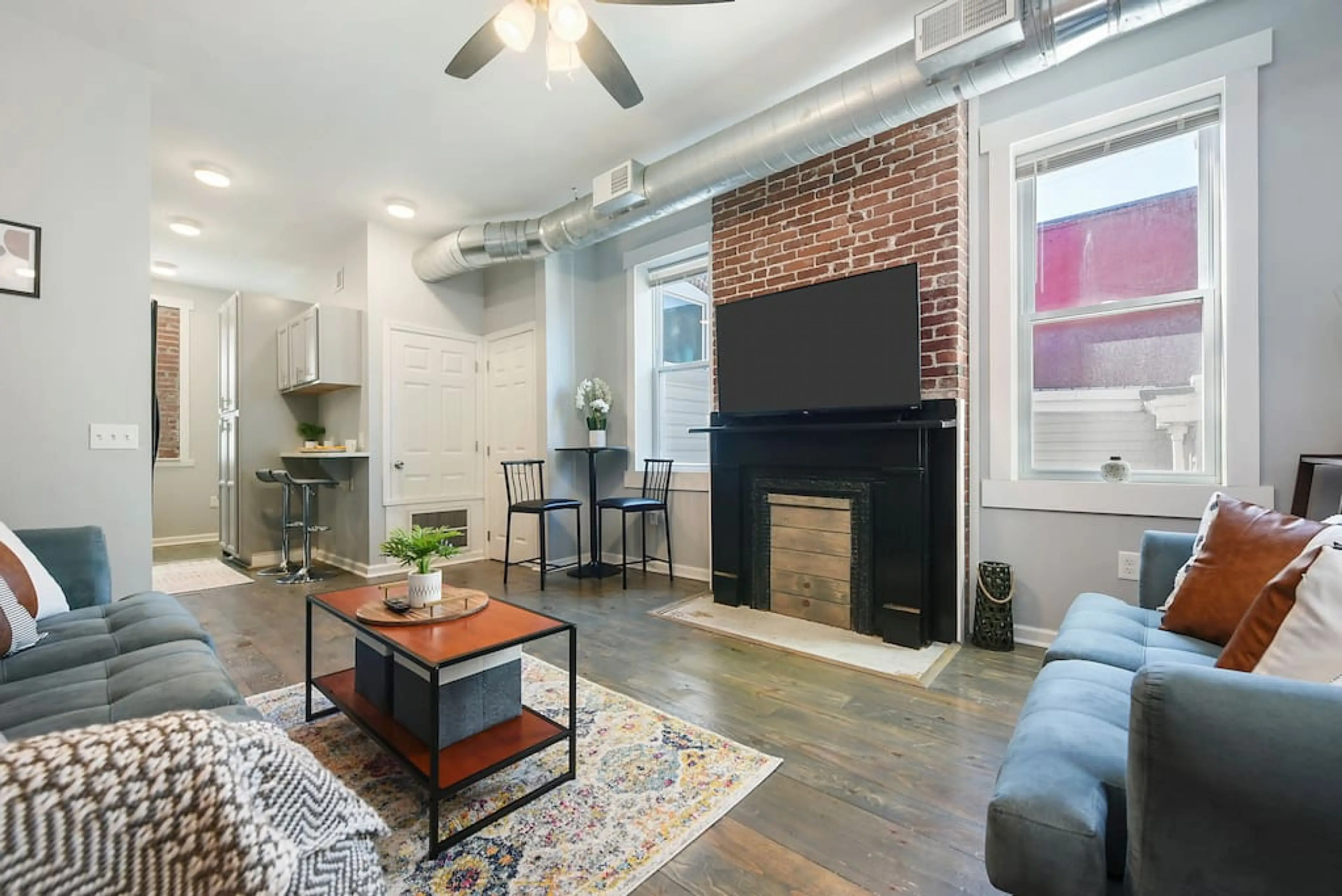 You'll walk in and say wow! With a gorgeous open floor plan, exposed brick, soaring ceilings, a spacious bathroom and two comfy bedrooms (king & queen beds), you'll feel at home! Work from home at your desk, whip up a cocktail or meal in the full kitchen, lounge on the couches and watch Netflix (inc...