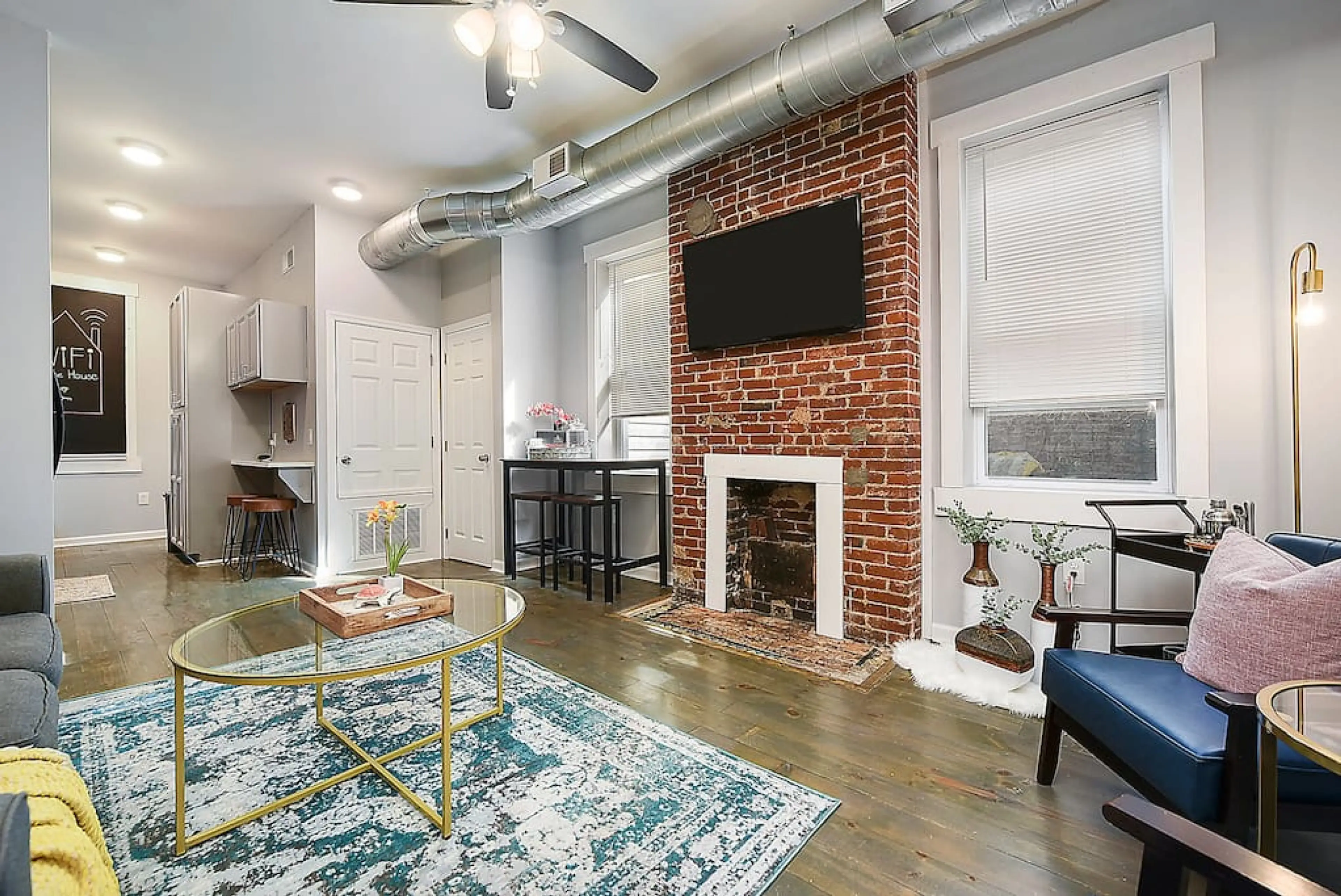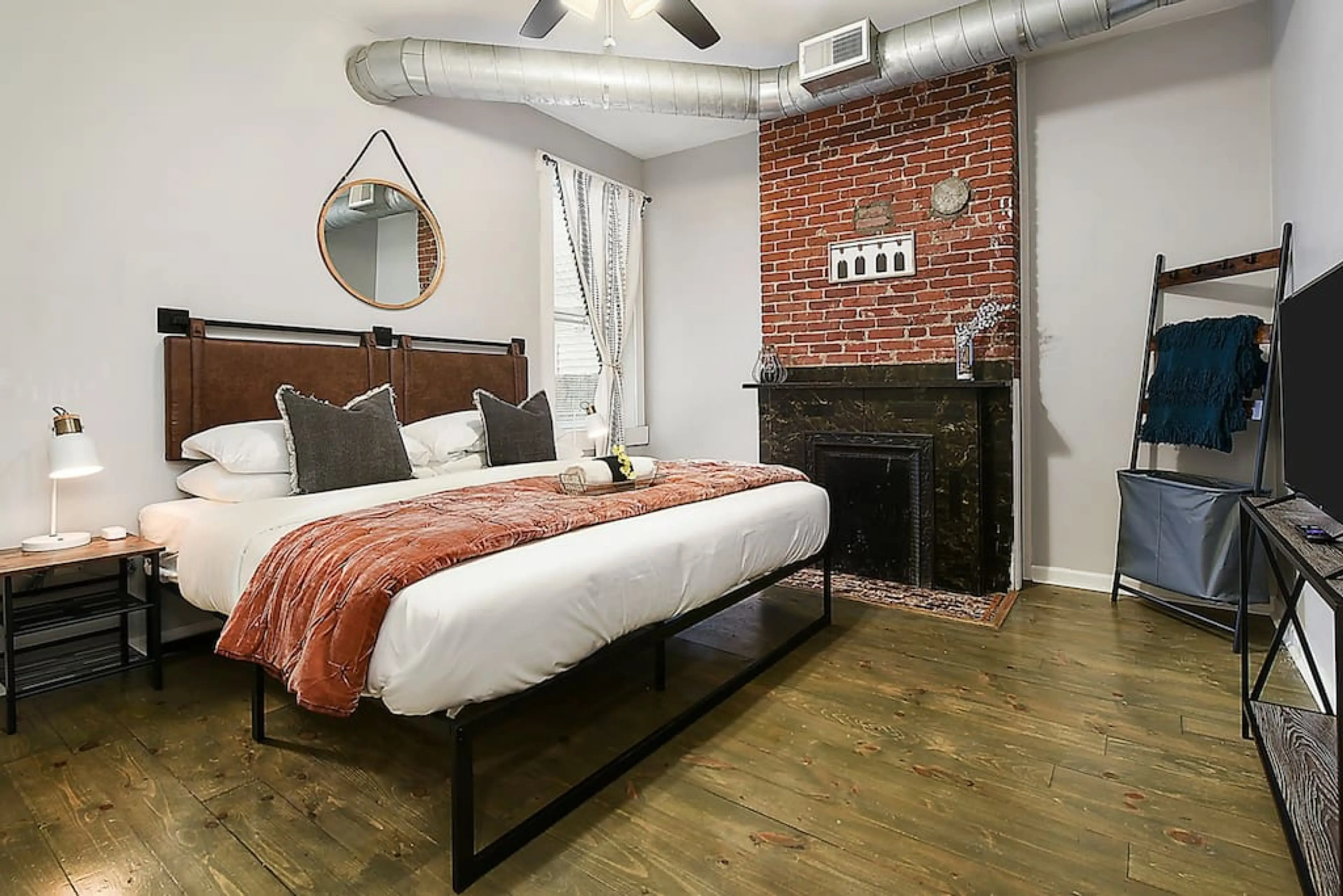 You'll walk in and say wow! This first floor apartment features a gorgeous open floor plan, exposed brick, soaring ceilings, a spacious bathroom and two comfy bedrooms (king & queen beds). Work from home at your desk, whip up a cocktail or meal in the full kitchen, lounge on the couch and watch Netf...